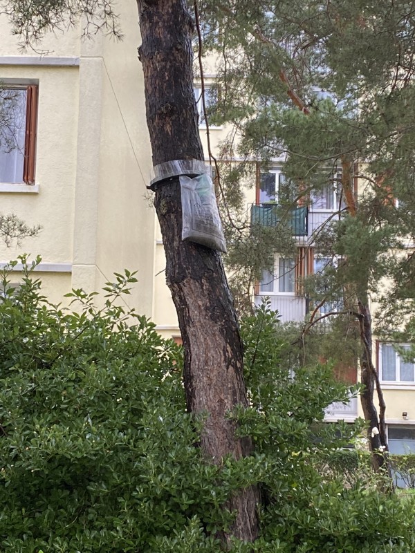 Ils ont par la suite effectué la pose de 2 cerclages écologique avec leur sac collecteur permettant la récupération des chenilles processionnaires.